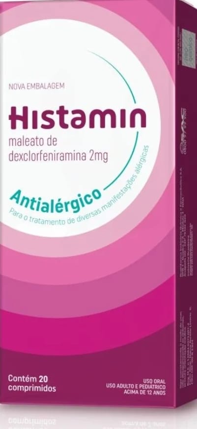 Histamin 20 mg 20 comp. possui como princípio ativo o Maleato de Dexclorfeniramina que é um isômero dextrógiro do Maleato de Clorfeniramina; pertence ao grupo farmacológico dos antagonistas dos receptores H da 1 Histamina atuando assim na prevenção e alívio de muitas manifestações alérgicas; é absorvido pelo trato gastrintestinal e atinge o pico de concentração plasmática entre duas horas e meia a seis horas após administração oral; cerca de 70% se liga às proteínas plasmáticas; a duração da ação é de 4 a 6 horas; é extensamente metabolizado; é excretado na urina na forma de metabólitos e pequena porção na forma inalterada.